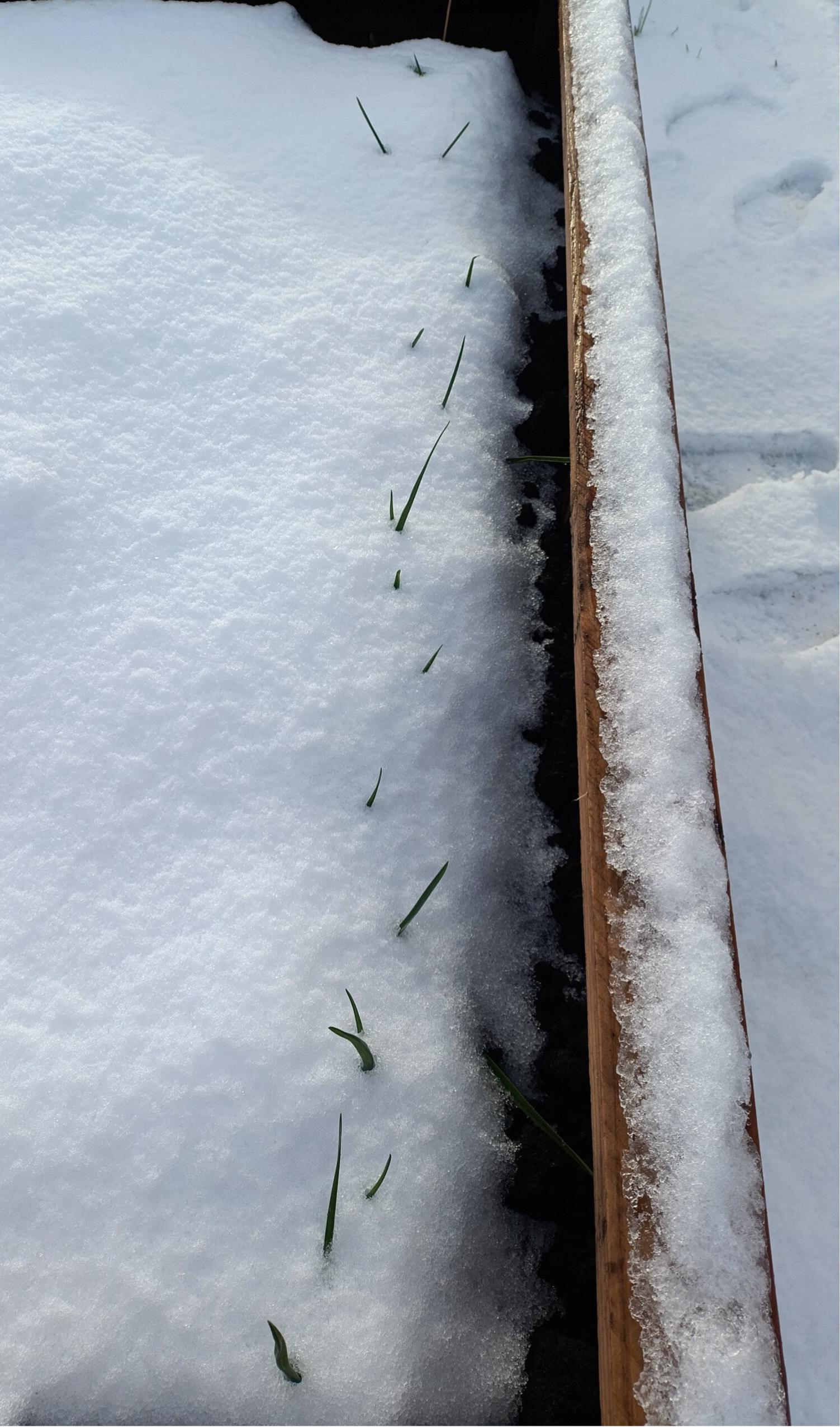 De knoflook verbaasde mij misschien nog wel het meest. Ik heb gekozen voor Spaanse knoflook, welke dus van warmte houdt. Nu staat de knoflook bij mij buiten en dus ook in een flinke laag sneeuw! Heeft hij er iets van? Nee eigenlijk niet. Op een gegeven moment was er zelfs geen knoflook meer te zien omdat er zo een dikke laag sneeuw op lag! De sneeuw dooit en de groene sprieten komen gewoon weer onder de sneeuw vandaan tevoorschijn alsof er niks gebeurd is!
